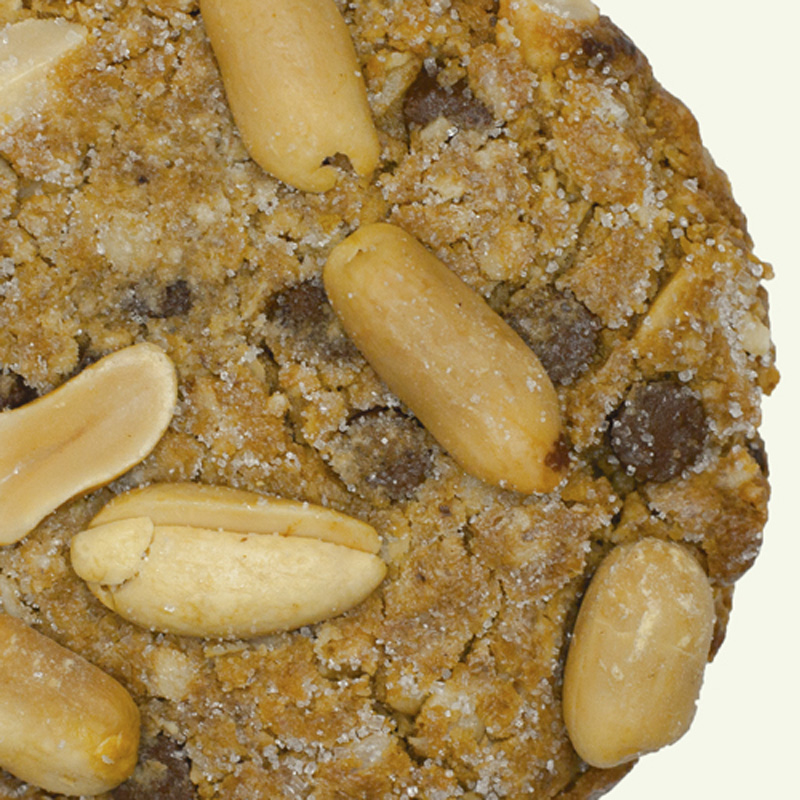 Hearty toasted oats, freshly roasted peanuts and a generous amount of gourmet chocolate morsels bound by earthy sweet brown sugar and rich cream butter. Featuring a firm chewy texture accented by a touch of imported vanilla and topped with whole roasted peanuts.
